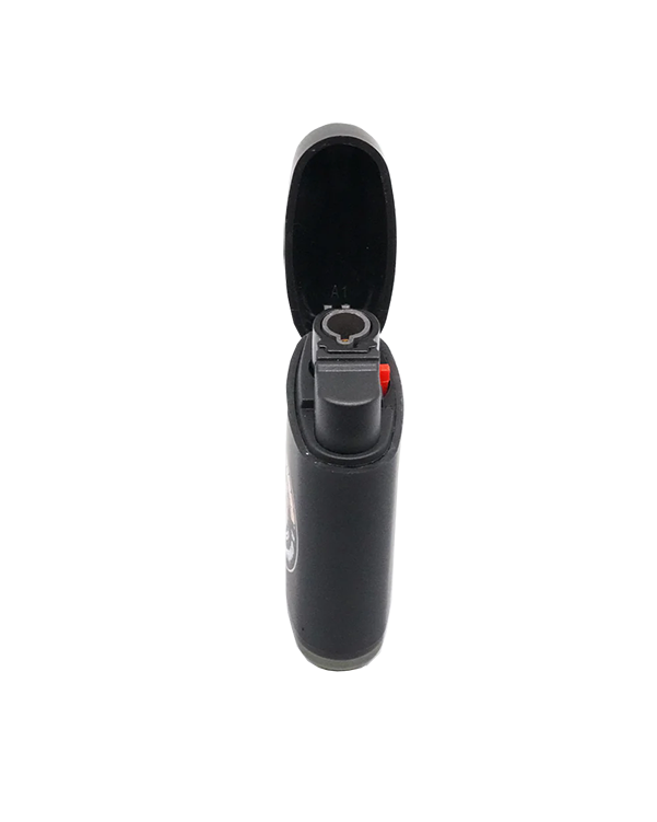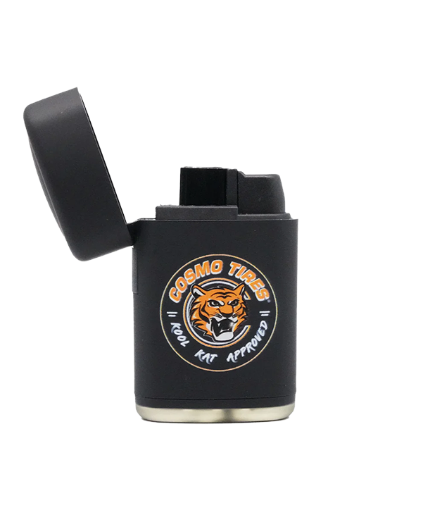 - A sleek black torch lighter featuring the Cosmo tires logo.