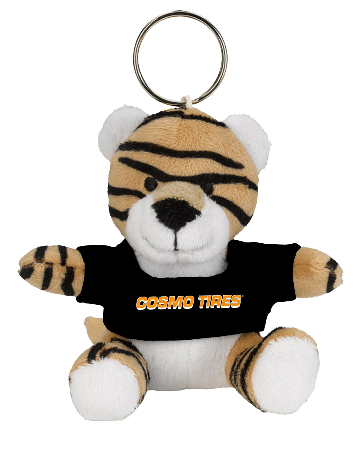 - Plush tiger keychain featuring black “COSMO TIRES” tee
